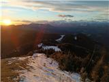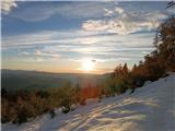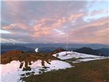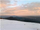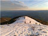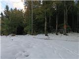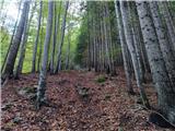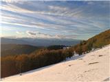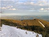 Včeraj sva za Blegoš izbrala povsem drugo izhodišče in sicer pod Črnim vrhom, t.i. pri kasarni. Pričela sva v megli, a z višino je bilo le te vse manj. Razveselila sva se, ko sva prišla na nekakšno križišče poti, Slugov grič in si ogledala vse možnosti. Že tam sva se odločila, da se bova vračala preko Slugove doline, saj je bila z moje strani radovednost zelo velika, in to že mnogo let