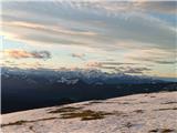 Vrh je bil včeraj čudovit razglednik proti Julijcem, pa tudi proti Karavankam in Kamniškim. Proti jugu in tudi drugje po nižinah, pa so plavale in valovile megle, le Snežnik je izstopal iz tega meglenega morja. Na vrhu ni bilo videti nikogar, da bi malical, vsi so kar hitro pobegnila dol. Midva sva se vračala proti koči po spodnji poti. Nato pa sva nadaljevala, kot sva se že prej odločila , po nemarkirani poti preko Špehovš, in nato zavila v Slugovo dolino, kjer so pred leti postavili v zahvalo in priprošnjo novo kapelico, Videti je bilo, da stalnih prebivalcev tam ni več, novih vikendov pa kar nekaj.
