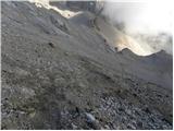 From the bivouac, continue south and after a short climb the trail leads to the glaciers. Here the trail turns slightly to the left and climbs up a rocky slope using the fixed safety gear. The sheltered path is short and quickly leads to scree. The path continues southwards along the scree and gradually becomes steeper. Higher up, the slope becomes quite steep and also dangerous for slipping. This path then leads to the saddle below the summit of Cima Ombretta di Mezzo.