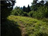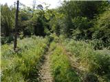 From Jelovška cesta 10 continue south-west, where after a few metres you will see the mountain markers for Črna prst. From the houses, the path turns to cart track, which will take you up to the WWI military cemetery of Ribro in a few minutes. A waymarked path bypasses the cemetery on the right and then leads across an expansive meadow where, a few minutes further on, you join the slightly wider cart track. Continue slightly left, then a few 10 metres ahead cross a dirt road where the initially distinct cart track gradually begins to climb. Higher up, at the fork cart track, take the right-hand fork, with the old markers for Črna prst alongside, and from this fork, slightly higher up, take another slight right onto a footpath which begins to climb more steeply. Keep climbing along the fairly sparse waymarks, then on a small mown meadow reach cart track, which is followed to the left, and in a few steps a wider dirt road is reached.