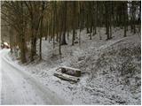 Here, the path from St. Lawrence (the church above Dragomer) joins first from the left, and a little further on from the right, the Cankar's path. Continue on the marked path, which gradually begins to descend and, with few exceptions, leads through the forest. When the path descends for some 10 m, we are joined on the right by the marked path from Ključ or the Pavliček homestead.