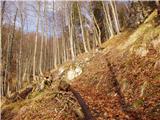 The trail then leads into the forest, where there is also a "very difficult trail" sign. The trail turns slightly to the left and leads to the entrance to the climbing part of the trail. The path climbs steeply up the slope, which is partly rocky and partly covered with grass, and then turns slightly to the right. It continues to climb steeply through a sparse forest and leads us to a ridge where we get a very nice view of the Kamnik Alps. We turn left, where a few wedges help us in the beginning, and then we climb along an unprotected ridge. The ridge is very scenic in the first part and in the second part we re-enter the forest through which we climb steeply a few times. Towards the end, the forest becomes more sparse and a few metres below the summit we come out of the forest, where we regain a very nice view on all sides.