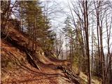 From the end of the road, cross the torrent and immediately afterwards the path climbs steeply and leads us in the keys to an inexpressible ridge. The way forward climbs steeply upwards through the forest. After a good 20 minutes of ascent, the steepness eases and the path leads us in a crossing under the saddle Kal. This is followed by a shorter climb along a mainly muddy track (the exception being longer periods of drought), which after a good five minutes leads us to pastures on the Kal saddle. Just a few dozen metres to the right, there is also a marked crossroads. We head straight for the Rogatec signs. The left-hand path leads to a bivouac, which is only a few dozen metres from the crossroads. The right path leads to mountain pasture Zg. Špeh.