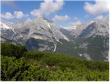 The path begins to climb here and initially passes through the forest alongside a landslide. Later the path turns slightly to the right and climbs a slightly steeper and slightly crumbly slope along a wide ravine. The path is well maintained and the ascent is therefore not particularly difficult. The path then climbs through the forest for some time. Higher up, the path turns slightly to the left and leads us out of the forest onto a slope that is mostly covered with dwarf pines. From the path, we start to see more and more beautiful views, and along the way we will also see a number of military tunnels and caverns.