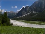 From the parking lot at the Hotel Fiames, continue along the main road or the path along the Boite river towards Cortina d'Ampezzo. After a few hundred metres, turn right over the bridge to Camp Olympia. Here, signs point you to the right onto route 408, which then leads you along a dirt track beside the bivouac. The path opens up a few views of the nearby Punta Fiammes and the Boite valley, before descending gently to a marked crossroads.