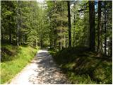 At the crossroads, the path to the Posporcora saddle and the climbing route to Col Rosa branch off to the left. We continue on the gentle dirt track northwards and after 15 minutes' walk the path leads us back to the crossroads where we turn left onto route 447, following the signs for 'Col Rosa'.