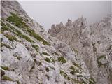 The path to Brana leads up to the left, and we continue slightly to the right, continuing our ascent and crossing the slopes to the west. From the scree slope, the path briefly leads to a grassy slope, and then the path becomes more difficult. Here we descend left down a well-protected unmarked gully, which leads us into a slightly thickened ravine. This is followed by a traverse of steep slopes to the west, which leads to the Kotliči notch (1949m).