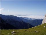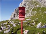 From the hut at Kamnik saddle, continue left in the direction of Brana along the path which leads us across the meadows to a crossroads, where we continue slightly left (right down Okrešelj). The path which continues to climb up the increasingly rocky slope quickly leads us to a scree slope, which is dangerous in the snow for slipping. The scree is crossed in a slight cross-climb, and then the path leads to the next crossroads.