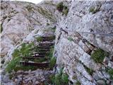At the home, take the path towards Kamnik and Savinja saddle. Soon you will come to the edge of a meadow where there is a crossroads. Continue left in the direction of Kamnik saddle on a path which climbs moderately at first through the forest and then through lane of bushes. The path then lies completely flat and in a short crossing leads us to a scree slope on which we climb along a well-worn path to the entrance to a less difficult wall. Next, with the help of a number of fixed safety gear, we climb a step higher, where the steepness eases a little, but the path is still quite steep and exposed to falling rocks. Higher up, the path leads to a steep and slip-prone scree slope, which is only traversed. There is a short climb up a wide and slightly exposed shelf, after which the path leads us to the vast grassy slopes of the Kamnik saddle. Only a few steps further we reach a crossroads, where we continue to the right in the direction of Turska gora and Brane (left Kamniška koča na Kamniškem sedlu 10 minutes). The path, which continues to climb on an increasingly rocky slope quickly leads us to a scree slope, which is dangerous to slip in the snow. The scree is crossed in a slight cross-climb, and then the path leads to the next crossroads, where we continue on the right path (left Brana). The path then crosses the slopes below Brana for some time, and then descends into a distinct notch called Kotliči, using the fixed safety gear. The well-protected and very steep path then leads to the most scenic part of the route. Following the well-protected path, we climb through the 'bottomless barrel', a natural window in the rock face of Turska Gora. The steepness then gradually eases and the increasingly scenic route quickly leads us to the summit of Mount Turska. Cottage under the Rinka waterfall - home on Okrešlju 1:15, home on Okrešlju - Turska gora 3:15.