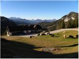 From the shepherd's hut, walk to the second part of mountain pasture, and continue straight ahead at the crossroads (right Peca - Austrian route). The road then climbs a little more and then passes a ramp to a small crossroads, where you join the wider road leading from Globasnitz to Železna Kapla / Bad Eisenkappel. Follow the road to the left and it climbs for a short distance before gradually descending. The road continues past the Church of All Faiths, and we follow the road, which has since become tarmac, to the Riepl Inn.