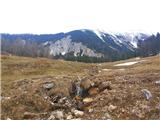 After a few metres in the forest, take the logging trail, which turns left and climbs steeply uphill to a small well, where you take the second logging trail and turn right. The marked path leading eastwards climbs only intermittently at first, and only steepens a little after it turns left at a slightly higher level and briefly becomes stony. When the gentle slope subsides, continue right along a section of the unmarked path, which turns slightly left shortly afterwards, and at the same time opens up some views of the valley. A little higher up, the marked path turns slightly right, back into the forest, where it leads us eastwards for some time, following and following logging trail. As the path begins to take on the appearance of a forest road, we cross the Sevnik stream on the flat. Slightly higher up, after a left turn, there is a fork: first right - the path to Ajdno (marked), second right - continuation of the marked path towards Valvasor's house (marked), straight ahead - Spodnji Rovti (unmarked). Leave the marked path here and continue straight uphill, following logging trail along the stream on the left. When you reach the forest cart track, leave logging trail and head left towards the house you see there. Cross the stream in front of it on a small bridge and continue straight ahead for a few metres to a steel cable on the left. Here turn right at right angles, onto the grassy slope of the Lower Rovt, where a less obvious path leads uphill. In the beautiful, undulating meadows here, we now have a better view back towards the valley and the Julian Alps with every step we take. At the top of the open grassy slope, the path leads us back into the woods again, where, after crossing a stream, it turns slightly left at first and climbs more steeply. A little higher up, the path crosses a short cart track and then turns only slightly to the right, soon also leading to the southern edge of mountain pasture, where (if necessary) a grazing fence is crossed. From here, follow the path along the forest edge on the right for a short distance. Soon you will come out on the vast grassy slopes of Potoška planina, and a little higher up you will cross the grazing fence for the last time, and continue along the stream to the shepherd's hut at Potoška mountain pasture.