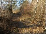 From the church, go back a few metres towards Pivka, then head west on the narrower road that begins to climb gently through the village. Continue straight through the village, and the asphalt road turns into a stone macadam road after the "last" house in the village. The road continues to climb steeply through lane of bushes and leads to an unmarked crossroads, where you continue to the right. The road then passes out of the scrub to the edge of extensive and fenced pastures. A little higher up, you reach the next crossroads, at which you see signs for Pivka. Continue in the direction of Pivka and after a few minutes of further walking you will reach the marked footpath Pivka - Šilentabor.