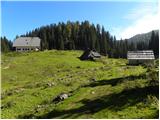 From the marked parking lot at mountain pasture Blato go back a few 10 steps, then take the wide and initially quite steep cart track in the direction of mountain pasture at Jezero. After 10 minutes of relatively steep ascent, you reach a marked crossroads where you continue along the left steep cart track (straight mountain pasture in Laz), only to be joined a little higher by the marked path with mountain pasture Vogar. Continue along the wide, partly rocky cart track, which is laid down transiently higher up and then climbs steeply through a small hairpin bend. Just ahead, the path bends sharply to the left and leads into a cold valley called Pungrat, where it crosses an abandoned pasture fence. The path ahead starts to climb steeply again, then turns to the right and lays completely flat. Just a few metres further on, we join the path with mountain pasture Vodični vrh on our left, and we continue straight on and after 5 minutes of further walking we arrive at mountain pasture near Jezero, in the middle of which stands a mountain hut.