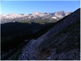 From Zeleno jezero, continue along the left-hand path in the direction of Zasavska hut (right Hribarice), which soon splits into two parts. Continue along the left path, which ascends directly towards Zasavska hut (the right path leads past Rjavo jezero) and after a few minutes leads us to an indistinct ridge (the border between Primorska and Gorenjska). Here, continue to the right (left Veliko Špičje, straight down Trenta) along the path, which leads us past the winter bivouac in a few minutes of easy walking to Zasavska hut na Prehodavci.