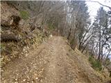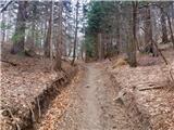 From the parking lot, continue across the pasture towards Hom Hill, which you can see ahead. The path turns slightly right in the middle of the pasture and soon starts to climb. Shortly, when the path turns sharp right, leave it and follow logging trail straight uphill towards the forest (to the right of St Katarina na Hom). Logging trail turns left at an uphill and starts to climb quite steeply through the forest, but after a few detours the steepness finally eases. Shortly afterwards, the path turns left and continues increasingly up the western slope of the hill. Here you follow the sloping and rutted logging trail, and overlook a wall off to the right. As the path climbs moderately higher, it narrows to a track below the top of the hill, and at this point the right-hand logging trail branch is again overlooked. The path along the slope, which turns slightly to the right through a predominantly deciduous forest, soon leads to a wooden cross and boxes with a register and a stamp at the top of the 834 m high Homa.