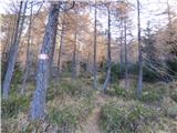 At the end of the parking lot, turn left onto the footpath after the signs "Biv. Montanel". The path leads quickly into the forest and then ascends the slopes northwards to a crossroads at mountain pasture Dalego.