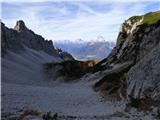 Here the path turns to the left and the trees become a little thinner, so that from the path we have better and better views to the west side, where the peaks of Civetta, Pelmo and Antelao stand out. Further along the path, it is mostly along dwarf pines and some larch trees. This path goes all the way to a grassy plain on which there are two bivouacs. The smaller one is permanently open and the larger one is locked.