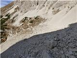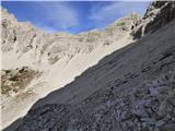 From the crossroads, the path slowly turns slightly to the left and leads out of the woods into dwarf pines. There is a short crossing and then you come to a narrow strip of scree. Continue for some time on the narrow strip of scree, which is surrounded by dense dwarf pines. The higher we approach the steep walls and the scree becomes a steep torrential gully, the markings direct us to the left into the dwarf pines.