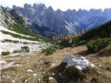 The path then climbs quite steeply and for some time passes through the rather overgrown dwarf pines. When you come out of dwarf pines the path straightens out a little and leads you to a scree slope. The path continues along the left-hand side of the scree below the eastern slopes of the summit of Crodon di Scodavacca. The path is sometimes a little less visible and is marked with red dots. The increasingly visible path continues along the scree and turns slightly to the left at a higher altitude. There is a final climb up to the Forcella di Crodon.