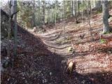 From the marked parking area, continue along the lesser road towards the caves below Babji zob and Babji zob. The road first leads us along the edge of the pasture, from where a beautiful view opens up to the highest peaks of Karawanks, and then, after a left turn, where we see the mountain direction signs, it gradually turns into the forest. Walk along the road for a few minutes, then at a relatively new crossroads of dirt roads continue slightly left (the crossroads was not marked at the time of the description) to cart track, which after a few metres turns even more to the left (straight ahead to the cave below Babji zob). A climb through the forest follows, and a few minutes higher up, cart track leads us to a hay meadow, where a wooden hut is located at its lower edge, and we have a beautiful view towards Lake Bled and part of Karawanks around Golice. Cart track takes us just a little higher to another hayfield, where the markers lead us to the right, to an initially less visible path that turns into a forest. Once in the woods, the path becomes easy to follow and starts to climb more steeply. A few minutes higher, you cross a new, not yet fully completed forest road, and above it, the waymarked path climbs quite steeply through the forest. As the path turns right, it flattens out a little, then climbs steeply to the right across steeper and steeper slopes. The slope becomes steeper as you get higher up, but the path is relatively wide, so there are no major problems crossing it, but a little more caution is needed in wet conditions, snow or leaves, especially when descending. After passing a few rock columns, the path turns left, passes into a valley, and a few steps further on out of the forest on mountain pasture Prihodi, which has just the right name, as we have arrived at the edge of Jelovice.