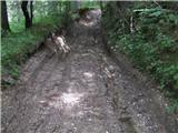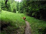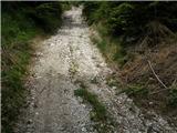 The track, which is becoming rough and muddy, climbs at first towards the NE, and later for a while also towards the SW. When the steepness eases, you come to a crossroads where you choose the right (or straight) direction. Here you initially follow the slightly overgrown cart track, which climbs steeper and steeper and becomes more cobbly. When the slope subsides, the path turns first slightly left and then sharply right to the north, where it becomes completely flat. At the next crossroads, continue right uphill, but later, due to fallen trees, leave cart track for a while and walk along it on the right. When you return to it, leave the forest on a spruce-covered slope, where you pass a clearing and re-enter the forest after a while. There is a few more ascents and curves, and then we come across a wod with an inscription. Enter mountain pasture, and after some 10 m come across a rocky ruin, where you first head right uphill to a lookout point, and from here to a shepherd's hut located on the western edge of mountain pasture.