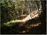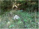 At mountain pasture Lower Grintovica, the marking "Pl. Grintovica", which directs you to the left to the water trough, but it is better to continue along the left edge of mountain pasture to the nearby cairn, where you can see the beginning of the path leading to Upper Grintovica. Here the trail turns sharp left and continues through a dense forest. After just 10 m, the "path" leading past the aforementioned trough joins us on the left, and we continue along the wide path, which after a further 10 minutes' walk leads us to mountain pasture Zgornja Grintovica (Upper Grintovica). At mountain pasture we will see the markings for Krstenica on one of the huts, which direct us to a clearly visible path that starts at the nearby mogic. The way forward ascends crosswise over the upper edge of mountain pasture, and then passes into a dense forest, where it starts to get lost in places, but there are no major problems with orientation, as the way is shown by unofficial markings in the form of arrows, and here and there we also see some old markings that have faded. The path through the forest climbs steeply from time to time, then turns slightly to the left, where it becomes more transitional and the forest becomes thinner. The path, which passes briefly through tall grasses, returns to the forest and climbs steeply. After a short steep climb through the forest, the path turns slightly to the right, where it crosses a torrential ravine, then turns left again and continues to climb along the edge of the torrent, which is quite wide here, so the path is damaged in several places in this part, but since the steepness is not very great, it does not cause us any major problems (some caution is still necessary). A few minutes of steep walking follows, and then the path suddenly flattens out and leads to a viewpoint on the eastern edge of mountain pasture Krstenica. From the viewpoint, continue along the gently sloping path, which, after a few minutes of gentle descent, leads to the huts on the aforementioned mountain pasture.