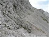 From the saddle, continue to the right along the marked path in the direction of Kalški greben and Krvavec. The way forward initially continues along and along the ridge, and then leads us to a crumbly ravine, after which we climb over a slightly exposed passage. The path climbs steeply and then passes onto the scree of Kalška gora (here, at the start of the scree, we will see the old climbing route to Kalška gora, which has been abandoned for many years). Crossing the scree follows (possible snowfields in early summer), and then the path turns left into the wall, where it climbs very steeply. During the climb up the relatively crumbly wall, the fixed safety gear (mostly rungs) and numerous handholds are helpful. The wall is slightly higher and after a few minutes of further walking the path leads to a small saddle where there is a crossroads.