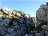 From the parking lot at the cargo cableway, follow the footpath towards Kokrsko sedlo and Grintovec. The path through the forest climbs gently at first, but this part of the path is short. After a few minutes of walking, the path starts to climb steeply and a little higher up we are helped by the fixed safety gear, which come in handy when the ground is wet and slippery (not difficult in dry conditions). However, the well visible and still steep trail starts to turn slightly to the right higher up. The steepness then eases for a short time and the path leads us out of the forest onto the avalanche slopes below Kokrsko sedlo. Here the path straightens out again and, with increasingly beautiful views (the most beautiful of which are of the peaks above the Kamnik Bistrica valley), climbs along the foot of the Kalška gora and Malá vrh walls. Easy to follow, but due to a lot of rocks (slightly overgrown scree) on the way, the path is tiring, and after a good 2 hour walk leads us to Kokrsko sedlo, where Cojzova koča (Cojz's hut) stands.