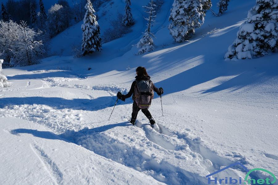 Na nasprotni strani zagaziva pršič. Kljub krpljam se krepko vdira